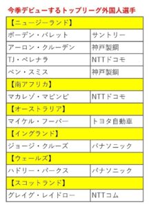 21日には元スコットランド代表の主将だったグレイグ・レイドロー(NTTコム)が対ホンダ戦で逆転トライ、2ゴール1PGで12得点。オーストラリア代表の主将、マイケル・フーパ―(トヨタ自動車)は対東芝戦で代名詞ともいえる「ジャッカル」を決めるなど存在感を見せ、チームを勝利に導いた。バレットと同じニュージーランド代表のTJ・ペレナラ(NTTドコモ)は22日の対キャノン戦で初トライ。逆転トライも演出して、W杯の日本代表・田中四朗とのSH対決を制した。