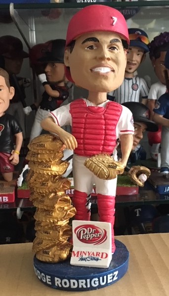 しかし、13個のミットを自慢するバブルヘッドが存在した。2014年にテキサス・レンジャーズが配布したイバン(アイバン)・ロドリゲス捕手のバブルヘッドは台座に置かれているとはいえ、13個のキャッチャーミットが高く積み上げられている。これはバブルヘッド史上最高のグラブ、ミット数の記録かもしれない。ロドリゲスは捕手として史上最高の2427試合に出場し、13度のゴールドグラブ賞もまた、史上最高の回数だ。21年間の現役生活でのべ7球団のユニホームに袖を通し、メジャー2年目の1992年から10年連続でゴールドグラブ賞を獲得。デトロイト・タイガースでも3度、受賞した。2017年に野球殿堂入りし、翌年にはレンジャーズがそれを讃え、背番号7を永久欠番にした。バブルヘッドで他球団でのゴールドグラブ賞もカウントするあたりに、ロドリゲスへのリスペクトぶりが感じられる。