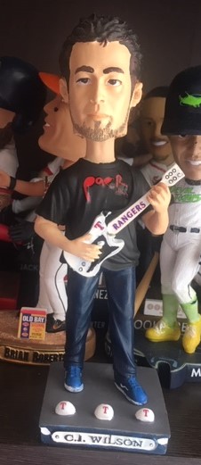 2017年に現役引退したC.J.ウィルソン投手はテキサス・レンジャーズ時代の08年にミュージシャンのようなバブルヘッドが作られた。Tシャツ姿で、手にしたギターの「RANGERS」の文字とチームロゴがなければ通算94勝を記録したサウスポーとは思えない。09年には5勝6敗14セーブ、19ホールドをマークしたリリーフだったが翌年、先発に転向すると5年連続2ケタ勝利。12年には大型契約でロサンゼルス・エンゼルスに移籍した。以前、NHK「ワースポMLB」で引退後に自動車ディーラーとしても成功し、カーレースにも挑戦していることが放送されていた。