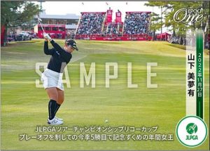 エポック社の「EPOCH-ONE」では早速、山下のトレカの受注受付をスタートした。山下にとって「EPOCH-ONE」の500円の「レギュラーカード」では7枚目になる。プロ初勝利の21年の「KKT杯 バンテリンL」は当時はまだ「EPOCH-ONE」の女子ゴルフカードが発行されていなかった。試合で5枚、アワードで1枚の合計6枚が作られていた。