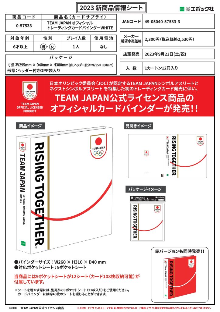 日本オリンピック委員会(JOC)が認定するTEAM JAPANシンボルアスリートとネクストシンボルアスリート を特集した初のトレーディングカード発売に伴い、TEAM JAPAN公式ライセンス商品のオフィシャルカードバインダーが発売!!