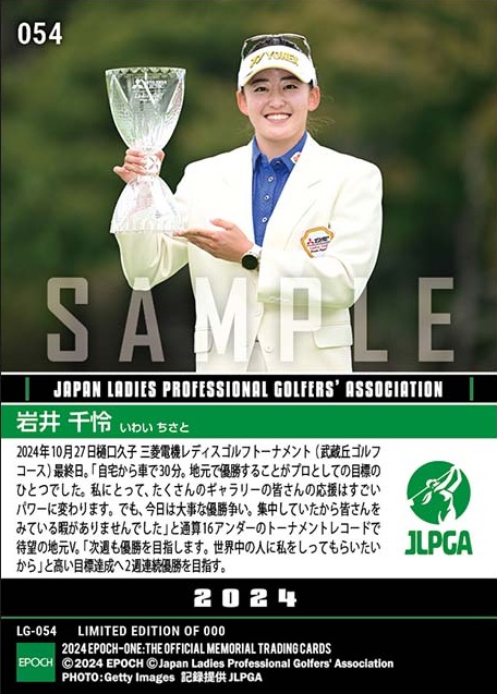 今回の岩井千の優勝を記念してエポック社のオンデマンドカード「EPOCH-ONE」から優勝記念トレカの発売が決まった。11月16日発売の「EPOCH 2024 JLPGA OFFICIAL TRADING CARDS TOP PLAYERS」にも姉妹揃って収録が決まっている岩井ツインズ。できれば「2023 JLPGAアワード」での「エポワン」以来の ふたりのツーショットのカードが見たいところだが、ふたりの笑顔のカードを揃えるまたとないチャンスなので、ぜひ手に入れてもらいたい。