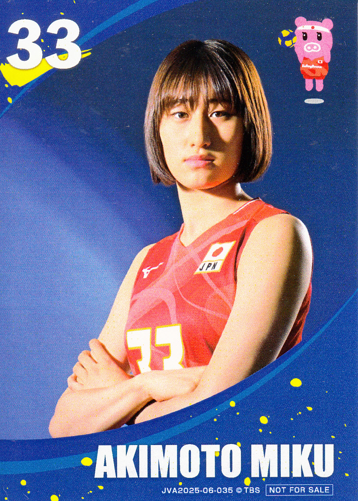 次代のエースとして注目度の高かった秋本だが、ネーションズリーグでのシニア代表デビューでさらに脚光を浴びた。トレーディングカードもまだ少なく、ネーションズリーグの中継に合わせてTBSが作ったカードしかない。れは、ネーションズリーググッズの購入者に配布された13種の「特典」カードである。ドイツではトレカは作られるだろうか。「日本代表」カードは9月に発売されるプロデュース216の「バレーボール女子日本代表 2025」トレーディングカードにも含まれておらず、次回作での、トレカでの代表デビューに期待したい。