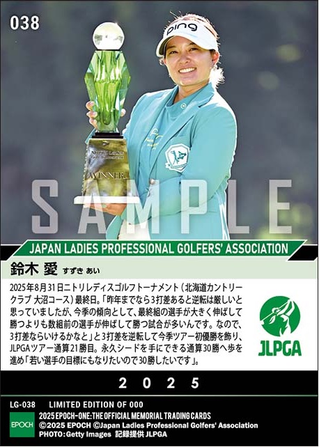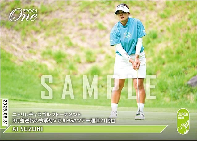 「ニトリレディスゴルフトーナメント」の最終日が8月31日、北海道カントリークラブ大沼コースで行われ、鈴木愛(セールスフォース)が今季初、JLPGAツアー通算21勝目を飾った。5バーディー、ボギーなしの68と伸ばして通算12アンダーで逆転。同大会では2019年以来のVとなった。エポック社のオンデマンドカード「EPOCH-ONE」は9月4日、鈴木の優勝カードの受注をスタートした。