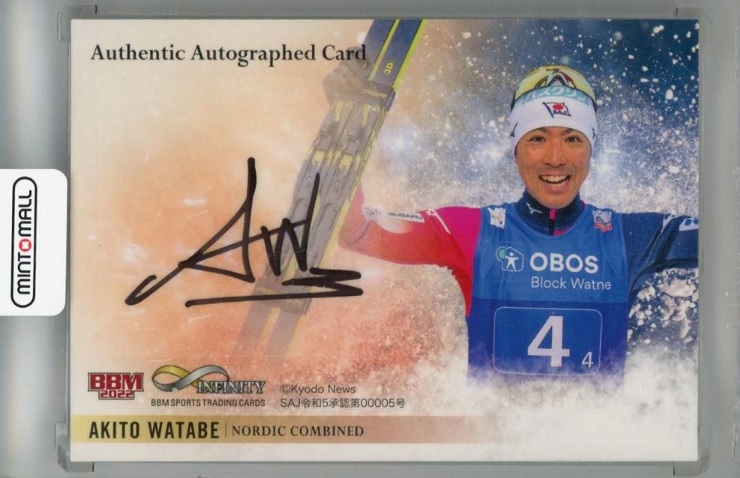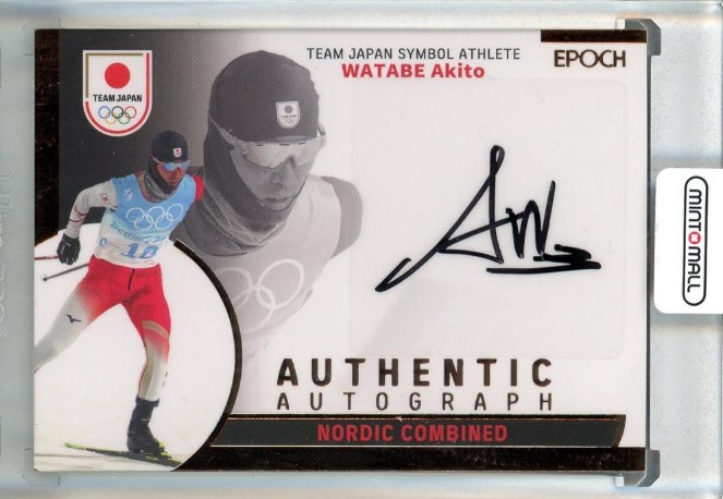渡部のトレーディングカードはエポック社の「TEAM JAPAN」カード、BBMのオールスポーツカード「Infinity」で制作されてきた。ノルディックスキー複合のレジェンドであるだけに、クロスカントリースキーとスキージャンプのそれぞれのカードがある。BBMでは2022年の「2nd バージョン」で、東京ドームでの巨人戦でマウンドに立った始球式カードもある。直筆サインカードも人気だ。