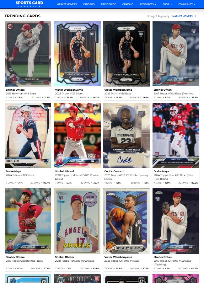 トレーディングカードの相場動向を追いかける米国の人気サイト「SPORTS CARD INVESTOR」で、大谷翔平投手(ロサンゼルス・ドジャース)のルーキーカードが高騰している。