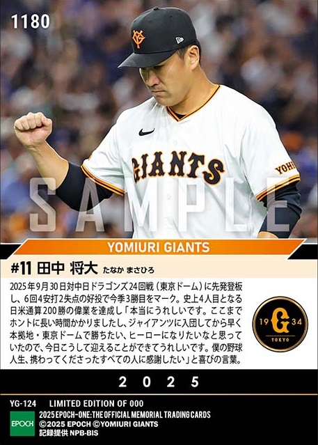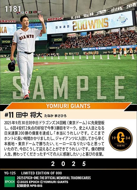 すでに、TOPPS社のオンデマンドカード「TOPPS NOW」が田中の日米200勝カードを発売。読売ジャイアンツだけでなく、東北楽天ゴールデンイーグルス、MLBのトレカ制作・販売の権利を持つ同社らしく、ニューヨーク・ヤンキース時代の田中の写真を使ったカードになった。