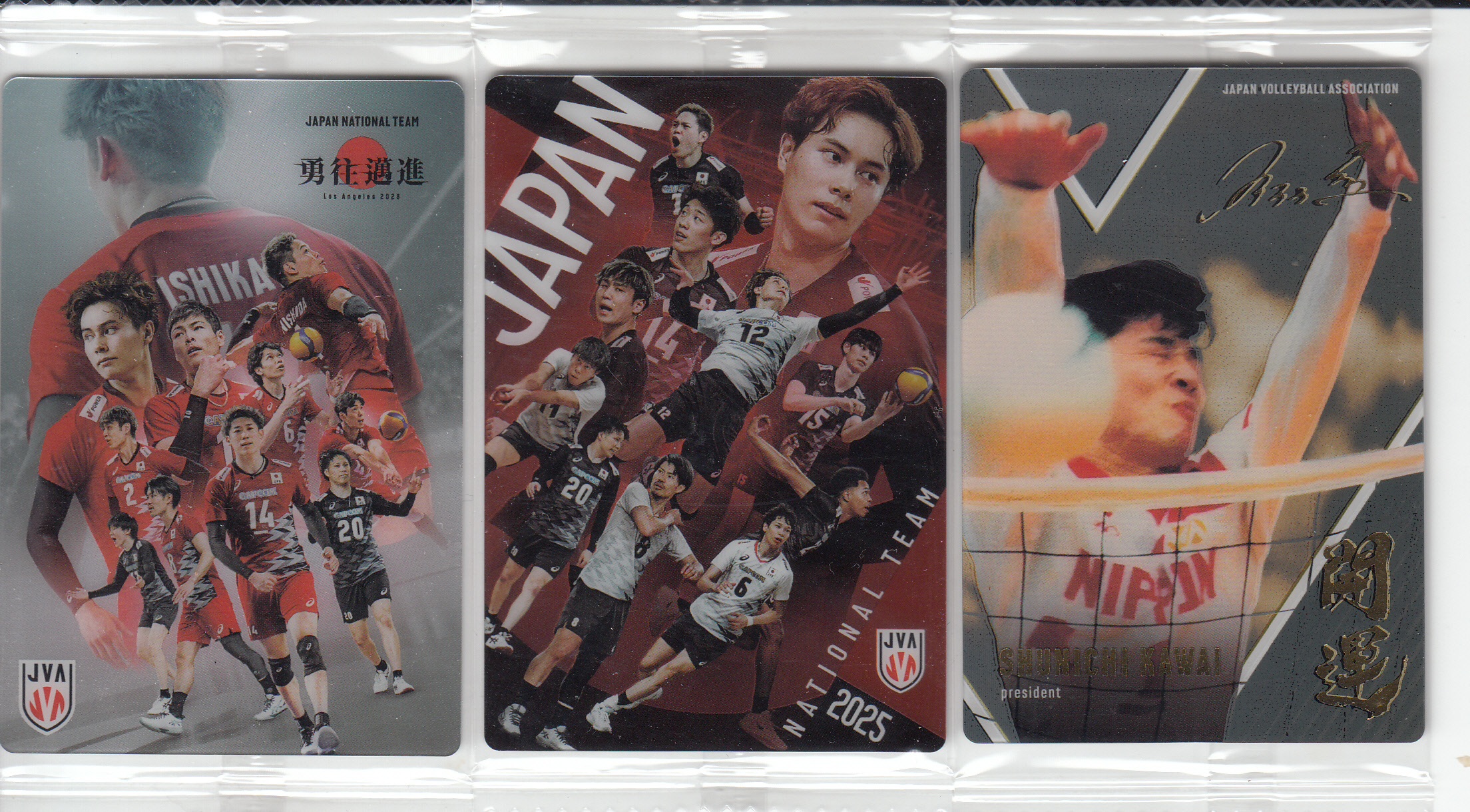 1パックにバニラクリーム味ウエハース2枚と、メタリックプラカード1枚をランダムに封入。カードは全38種類で日本代表チームから16選手をピックアップ。「ノーマル」が16種、「レア」も同じ選手で16種、スペシャルカードとして集合A、集合Bに、3種の「ユニフォームカード」、レジェンドとして日本バレーボール協会の会長でもある川合俊一さんのカードの6種のカードが収録された。