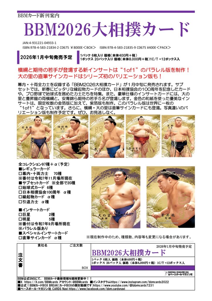 幕内・十両全力士を収録する「BBM2026大相撲カード」が1月中旬に発売されます。