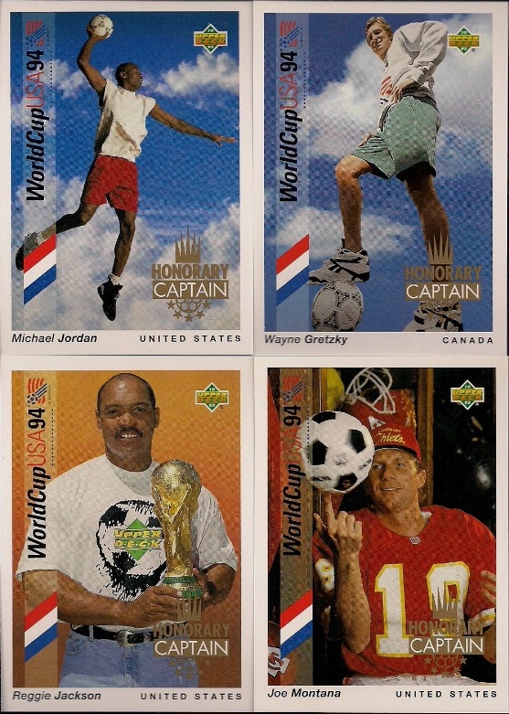 サッカーW杯と他のスポーツ選手とのコラボと言えば、1994年の米国大会でのUPPER DECK社の「HONORARY CAPTAIN」カードがある。1994年の米国大会と言えば、「ドーハの悲劇」で日本代表が本大会に進めなかった大会で日本のファンの記憶に残る。この時はマイケル・ジョーダンさん(NBA)、レジー・ジャクソンさん(MLB)、ジョー・モンタナさん(NFL)、今回の抽選会にも登場予定のグレツキーさん(NHL)の4大プロスポーツのレジェンドが優勝トロフィー、サッカーボールとともにカードになった。各OBが所属したチームロゴなどは記載されていない。ただし、いつものジャンプを見せるジョーダンさんのこのカードは現在でも高い市場価格で取引されているレアアイテムである。