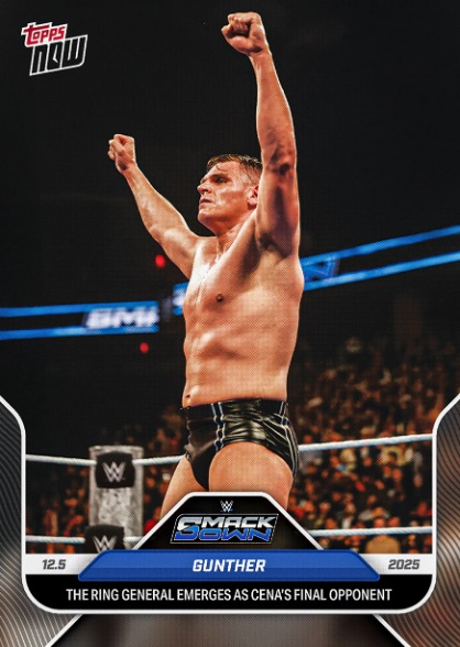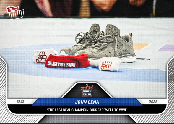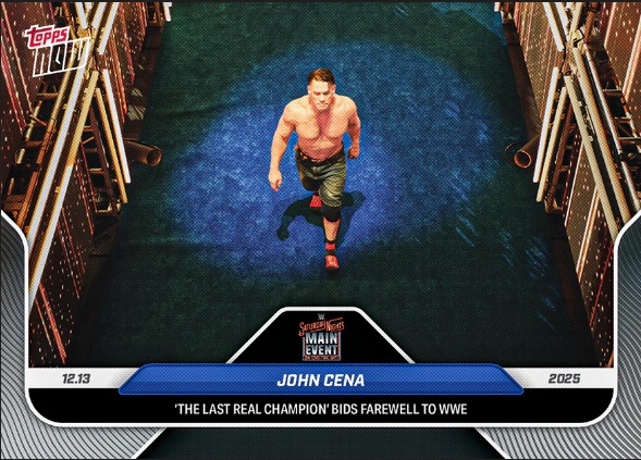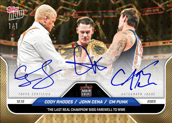 TOPPS社のオンデマンドカード「TOPPS NOW」では、この日のラストマッチに向け、予告のポスター、最後の相手に決まったグンターのトーナメント決勝の様子をカードにして盛り上げてきた。この日は、試合中の様子ではなく、試合後のローデス、CMパンクから2本のベルトをかけられたシーンをカード化した。購入者の中から抽選であたる「LUCKY HIT」には、3人のコラボサインカード、シナ単独のインスク入りサインカード、イメージバリエーションとして花道を去るシナ、リングに置かれたシューズとリスト、アームバンドのカードが作られた。これほどの種類の「LUCKY HIT」が作られるのは極めて異例で、さすが、シナである。
