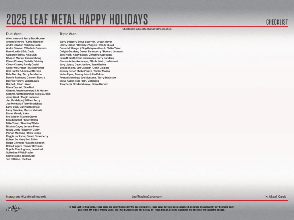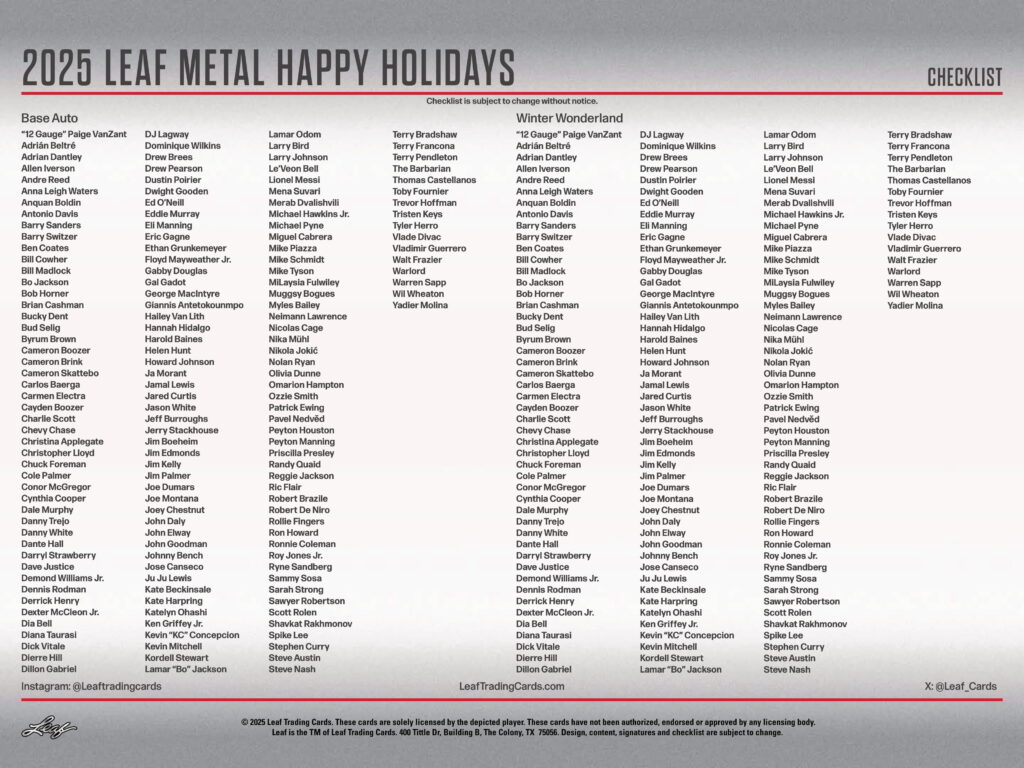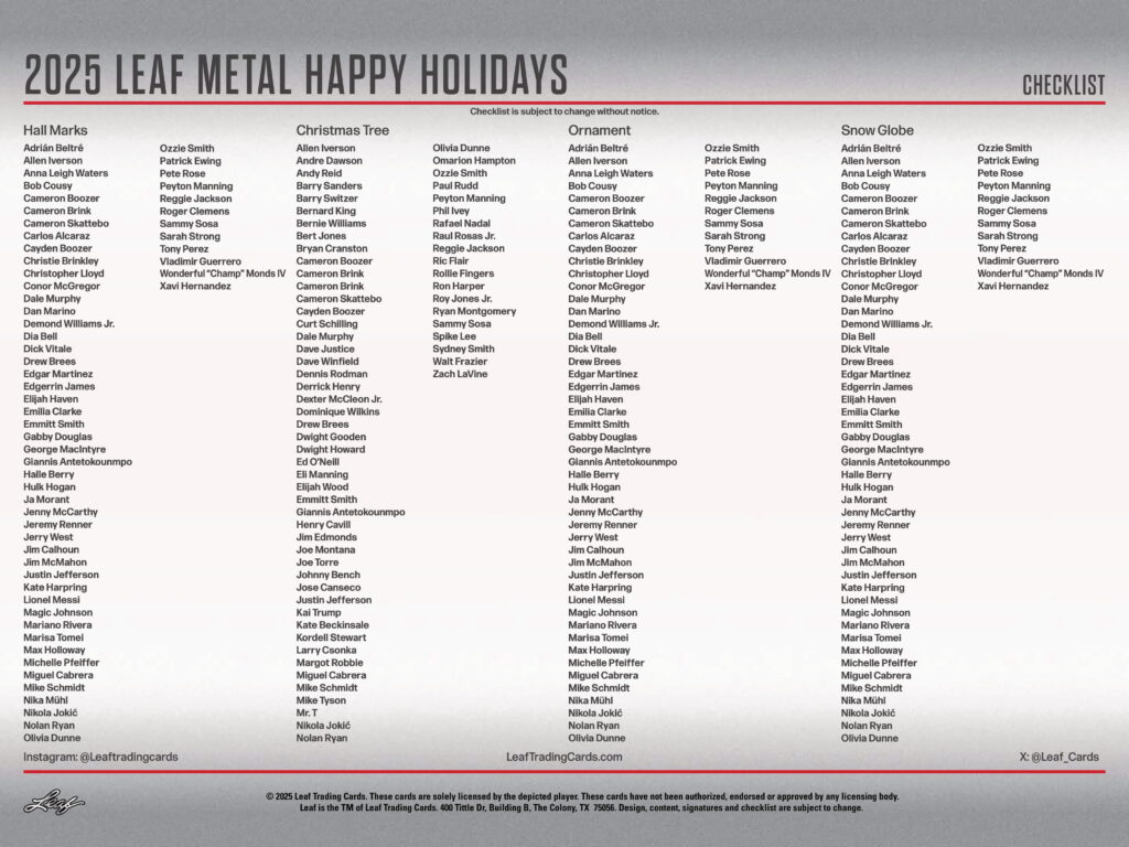 ケースごとに以下の有名人ら3枚封入⇒Anna Leigh Waters、Barry Sanders、Bo Jackson、Brian Cranston、Cameron Brink、Carlos Alcaraz、Conor McGregor、Emilia Clarke、Floyd Mayweather Jr.、Gal Gadot、Giannis Antetokounmpo、Halle Berry、Hulk Hogan、John Goodman、Kate Beckinsale、Larry Bird、Lionel Messi、Michelle Pfeiffer、Mike Tyson、Nicolas Cage、Nikola Jokić、Nolan Ryan、Olivia Dunne、Peyton Manning、Phil Ivey、Robert De Niro、Steve Austin、Spike Lee、Cam Skattebo、Derrick Henry。