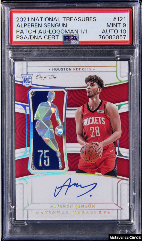 シェングンのPSA鑑定済みルーキーロゴパッチオートグラフカード。このカード以前に最も高値で取引されたものが60,000ドルにギリギリ届かないものであったことから、シェングンのカード需要も上がっていることが分かる。Golidn Auctionにて2025年4月に$85,400にて落札。