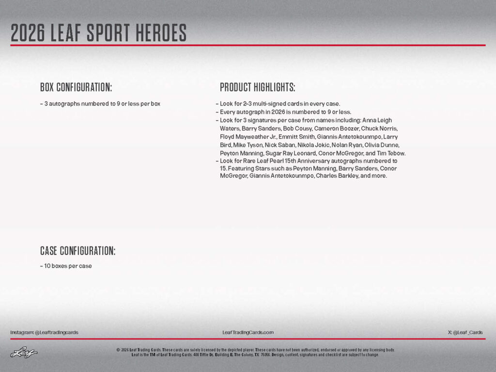 ◇ 次の選手からの直筆サイン: 3枚 → Anna Leigh Waters, Barry Sanders, Bob Cousy, Cameron Boozer, Chuck Norris, Floyd Mayweather Jr., Emmitt Smith, Giannis Antetokounmpo, Larry Bird, Mike Tyson, Nick Saban, Nikola Jokic, Nolan Ryan, Olivia Dunne, Peyton Manning, Sugar Ray Leonard, Conor McGregor, and Tim Tebow.