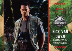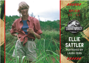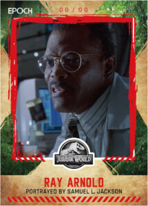 クリス・プラット(オーウェン・グレイディー)やローラ・ダーン(エリー・サトラー博士)など、シリーズ作品の人物たちを豪華に収録したレギュラーカードもベース色に加え、4色の箔押しパラレル展開!