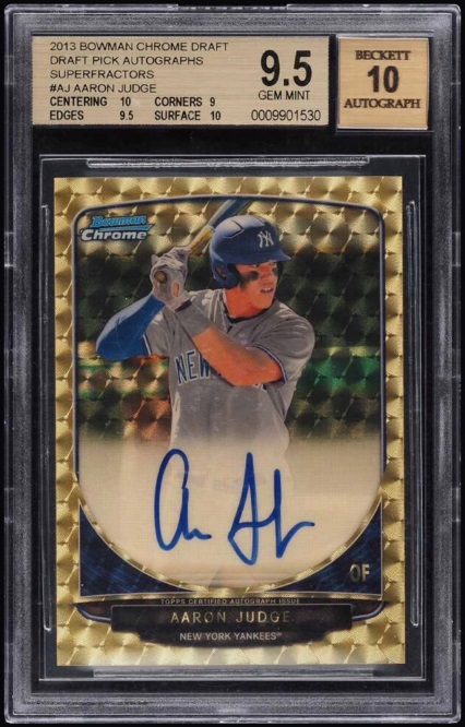米国大手オークションハウス「Fanatics Collect」は、アーロン・ジャッジ外野手(ニューヨーク・ヤンキース)の「2013 Bowman Draft Pick & Prospects」に収録された「Chrome」の1of1 Superfractorのサインカードが520万ドル(約8億1120万円)で落札された、と発表した。現代野球カード(2000年以降に制作されたもの)の最高額となった。