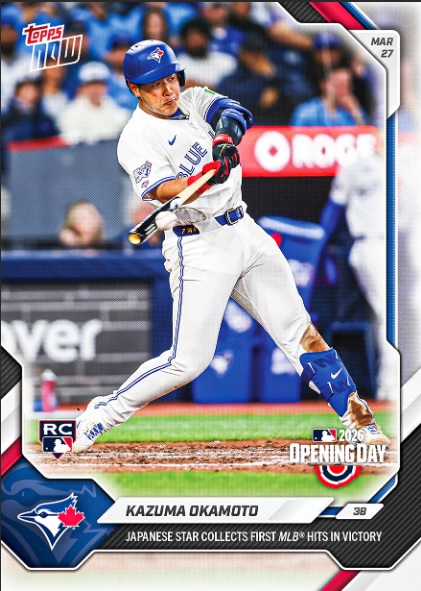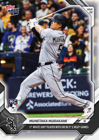 TOPPS社のオンデマンドカード「TOPPS NOW」では開幕戦デビュー本塁打に続き、村上の2試合連続アーチをカード化。27日は村上の開幕弾、28日は岡本和真内野手(トロント・ブルージェイズ)のデビュー戦2安打、そして、29日は再び、村上の2号アーチと異例の3日間連続の日本人ルーキーカード発行となった。
