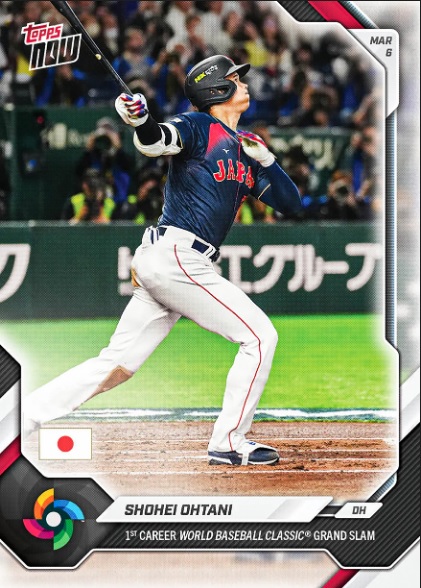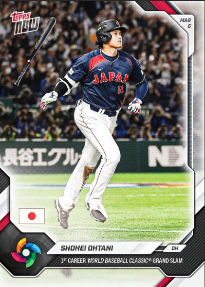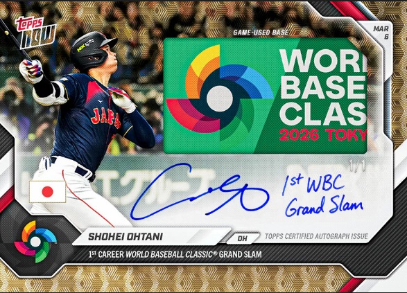 WBCのトレーディングカードの制作・販売の権利を持つTOPPS社では早速、オンデマンドカード「TOPPS NOW」では大谷の満塁本塁打カードの受注をスタートした。購入者の中から抽選で当たる「LUCKY HIT」は試合で使われたベースを裁断して挟み込み、直筆サインと「1st WBC Grand Slam」のインスクリプション(添え書き)入り。写真が違うイメージバリエーションもSPとなった。