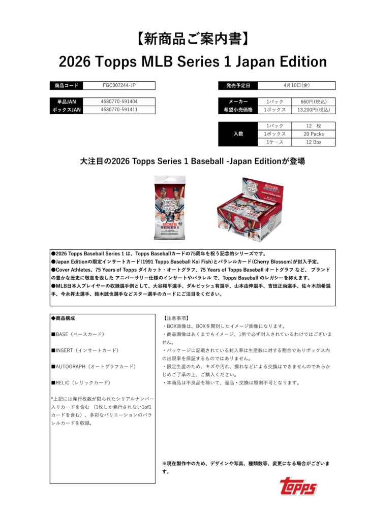 大注目の2026 Topps Series 1 Baseball -Japan Editionが登場!!