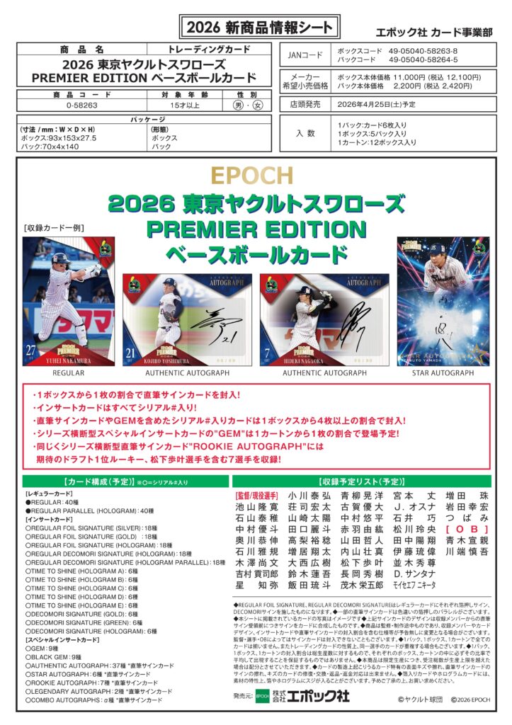 【製品情報】⚾ EPOCH 2026 東京ヤクルトスワローズ PREMIER EDITION ベースボールカード