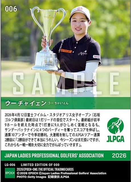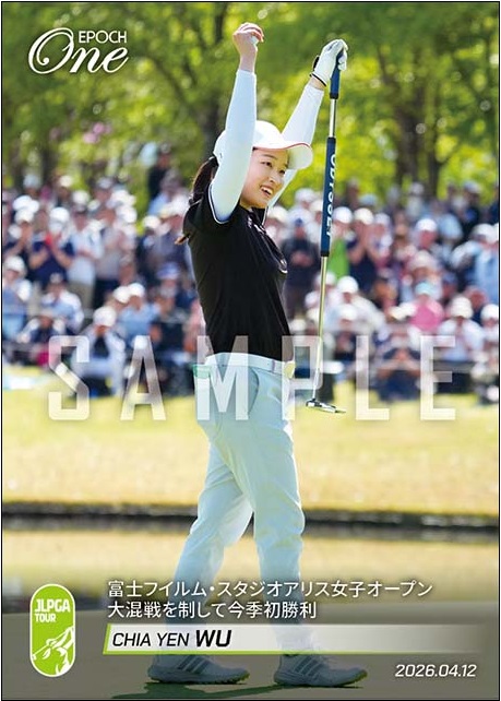 昨年の初優勝に続く、チャイェンの「EPOCH-ONE」は春のさわやかな太陽のような笑顔のガッツポーズ。「EPOCH 2026 JLPGA OFFICIAL TRADING CARDS ROOKIES & WINNERS」にも昨年のWINNERとして収録が決定している。エポック社のオンデマンドカード「エポワン」だけでなく、このスマイルは何度でも見たい。