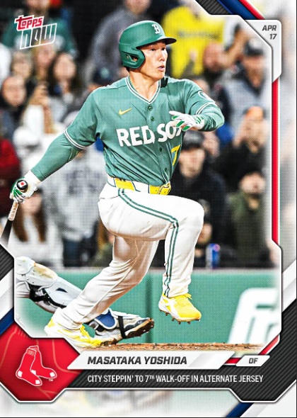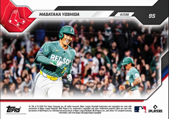 ライバル球団のニューヨーク・ヤンキースとともに熱狂的なファンが多いレッドソックスだが、チームにとってもボストンの町とのつながり、思いも深い。吉田のボストン愛を象徴するユニホームでの劇的な一打はTOPPS社のオンデマンドカード「TOPPS NOW」で限定トレーディングカードになった。