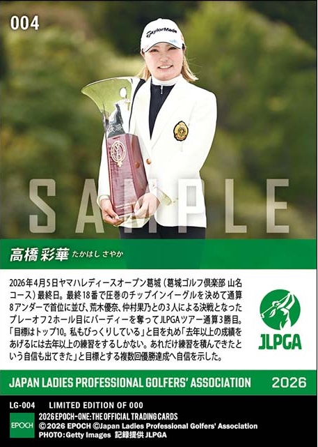 エポック社のオンデマンドカード「「EPOCH-ONE」では高橋にとって通算3枚目の優勝カードの発注を4月16日にスタート。5月30日に発売予定の「EPOCH 2026 JLPGA OFFICIAL TRADING CARDS ROOKIES & WINNERS」にも、もちろん、昨年の優勝者としてカードが収録される。