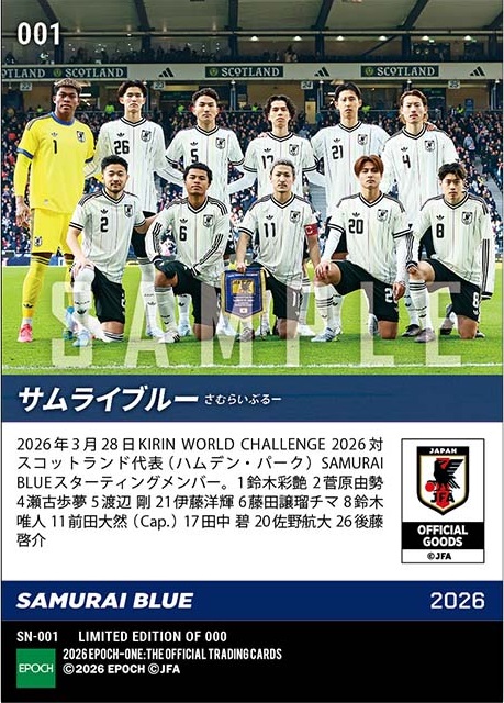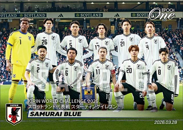 「EPOCH-ONE」は48時間のみ発注を受け付け、注文分の枚数しかプリントしない限定カード。今回は3月の英国遠征でスコットランド代表、イングランド代表と対戦し連勝した2試合のスターティングメンバ―が貴重なカードになった。