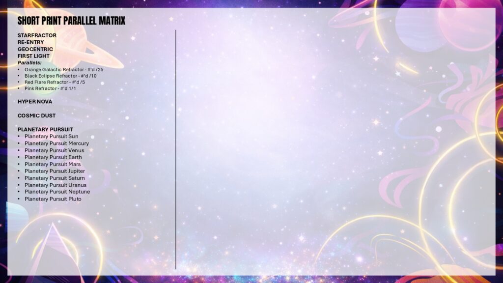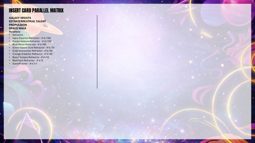 上記のリフラクターパラレル⇒通常、アクアイクイノックス/199、パープルネビュラ/150、ブルームーン/99、グリーンスペースダスト/75、ゴールドインターステラー/50、オレンジギャラクティック/25、ブラックエクリプス/10、レッドフレア/5、スーパーフラクター/1