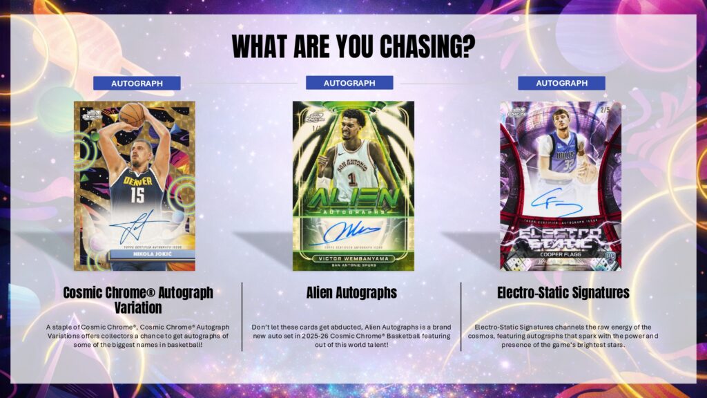 直筆サインの中にはCosmic Chrome® Autograph Variations、First Flight Signatures、新しく登場するAlien Autographs、Singularity Signatures、Electro Static Signaturesがコレクターたちを待っています!