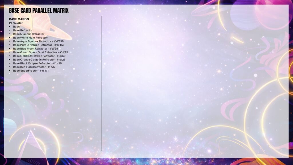 ベース(非リフラクター)、通常、ヌークリアス、ホワイトホール、アクアイクイノックス/199、パープルネビュラ/150、ブルームーン/99、グリーンスペースダスト/75、ゴールドインターステラー/50、オレンジギャラクティック/25、ブラックエクリプス/10、レッドフレア/5、スーパーフラクター/1