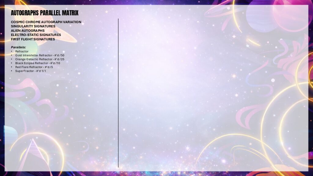 COSMIC CHROME VARIATION、SINGULARITY SIGNATURES、ALIEN AUTOGRAPHS、ELECTRO-STATIC SIGNARTURES、FIRST FLIGHT SIGNATURES