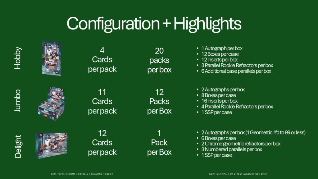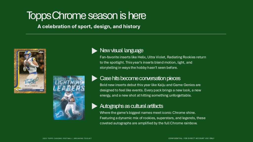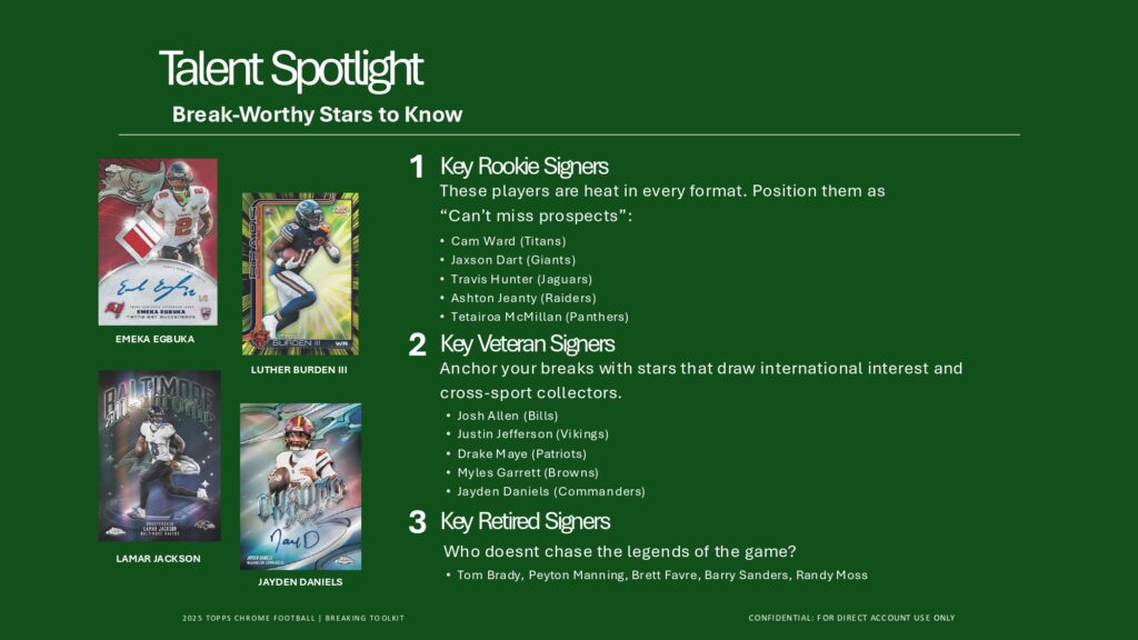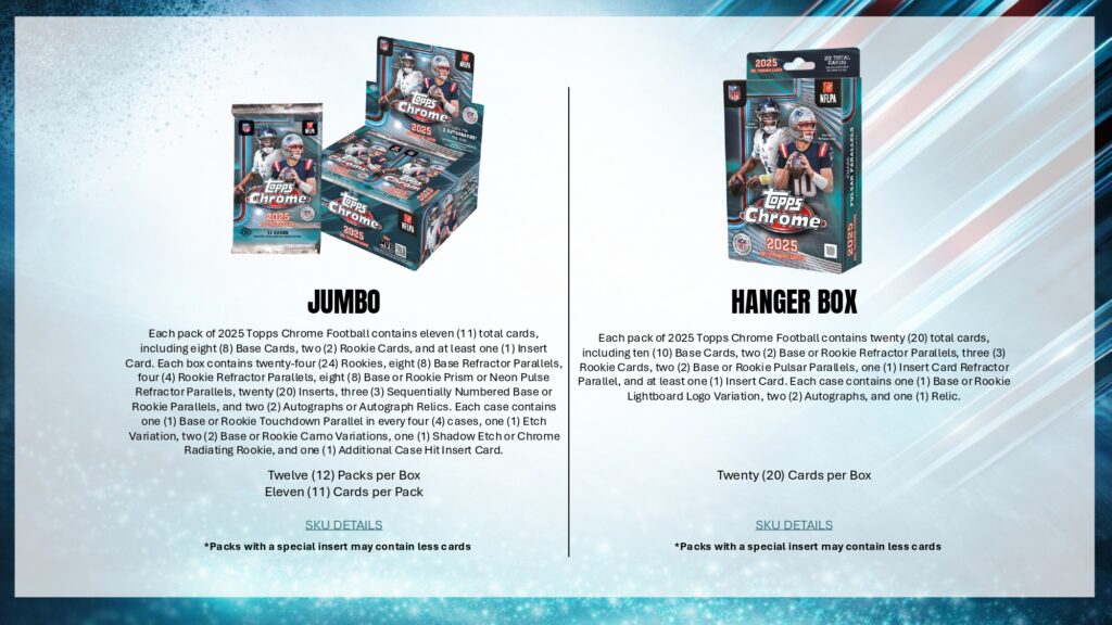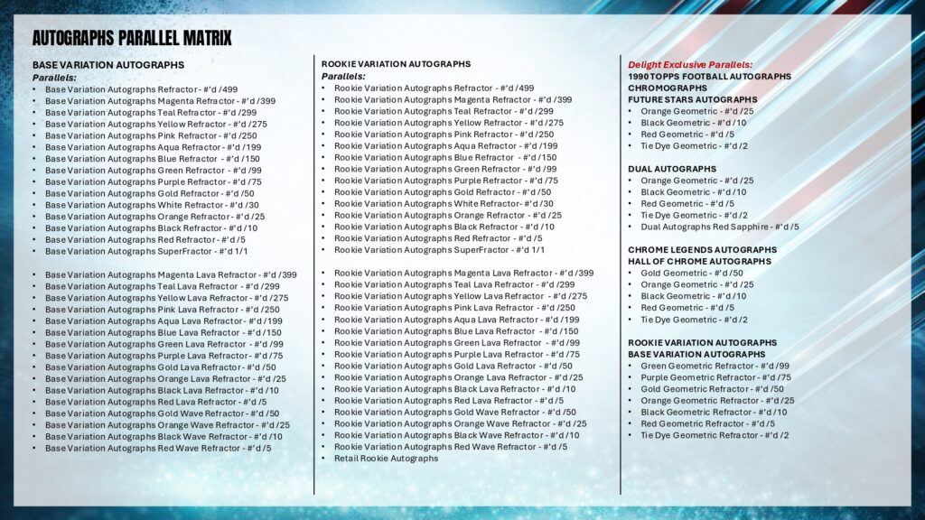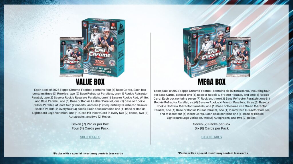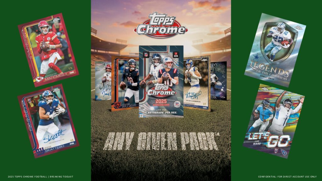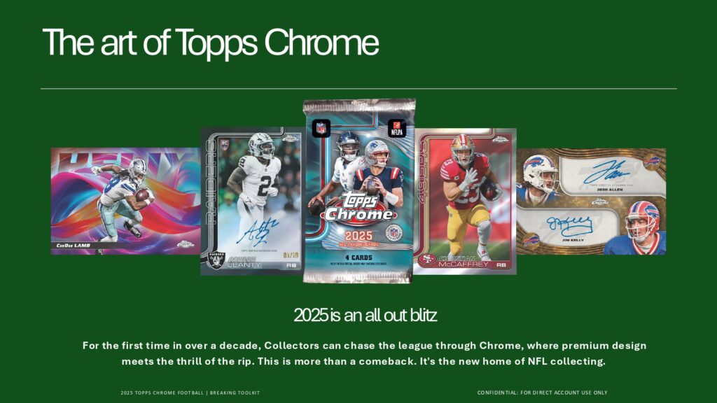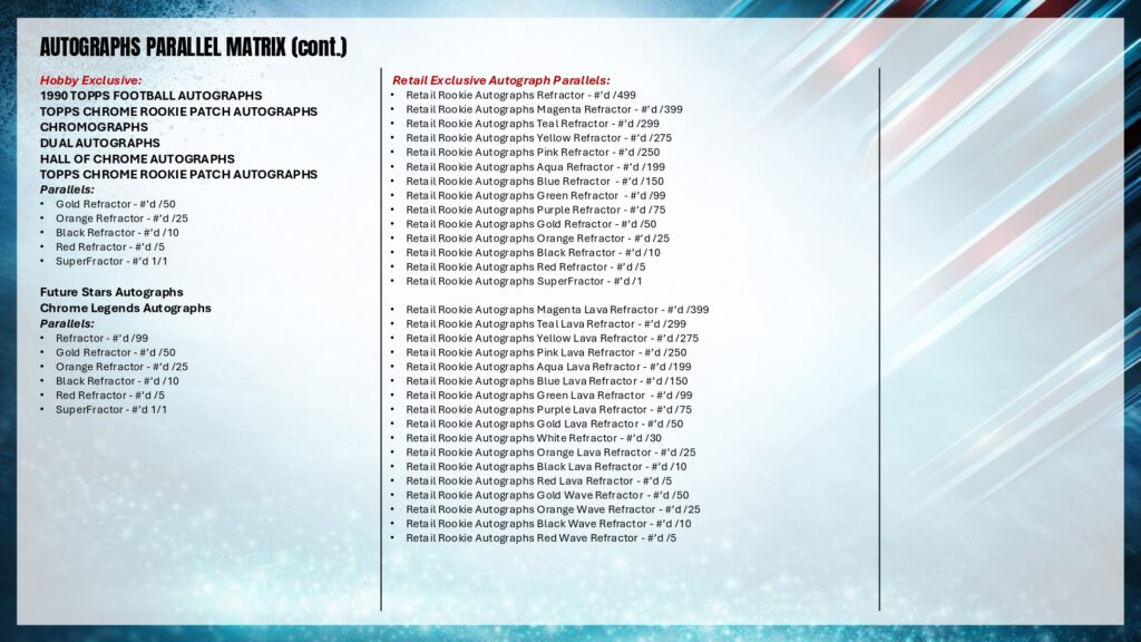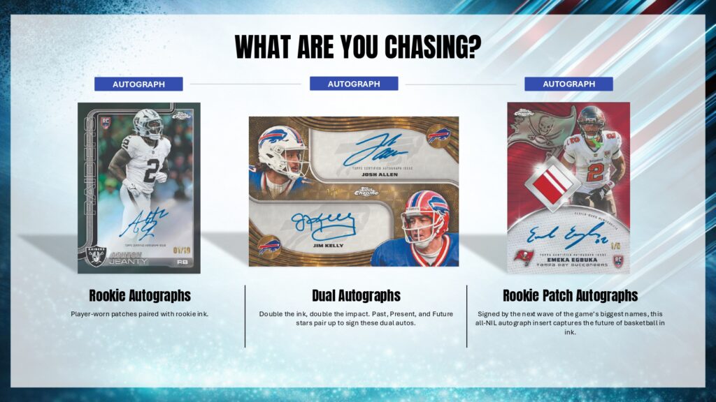 2025 Topps Chrome Footballでは、Rookie PREM1ERE Patch AutographsやTopps Chrome Autographsなど革新的ヒットを収録。