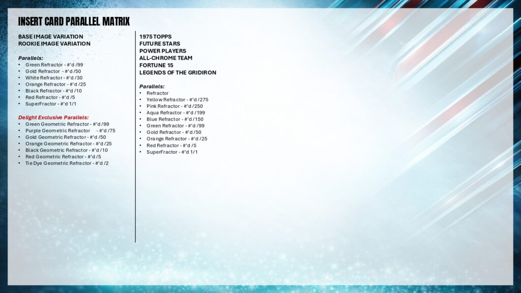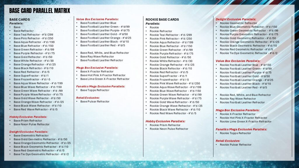 リフラクターパラレル⇒ルーキー(非リフラクター)、ルーキー、青緑/299、ピンク/250、水色/199、青/150、緑/99、紫/75、金/50、白/30、橙/25、黒/10、赤/5、スーパーフラクター/1、フローズンフラクター/-5、ピンクウェーブ/250、水色ウェーブ/199、青ウェーブ/150、緑ウェーブ/99、紫ウェーブ/75、金ウェーブ/50、橙ウェーブ/25、黒ウェーブ/10、赤ウェーブ/5