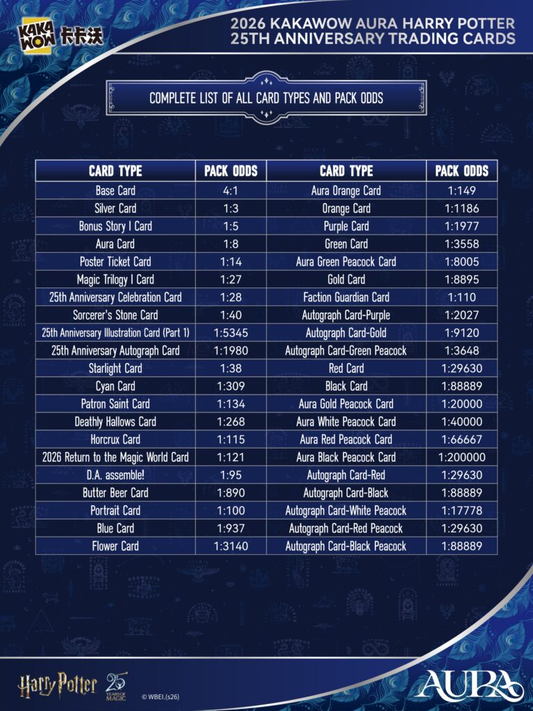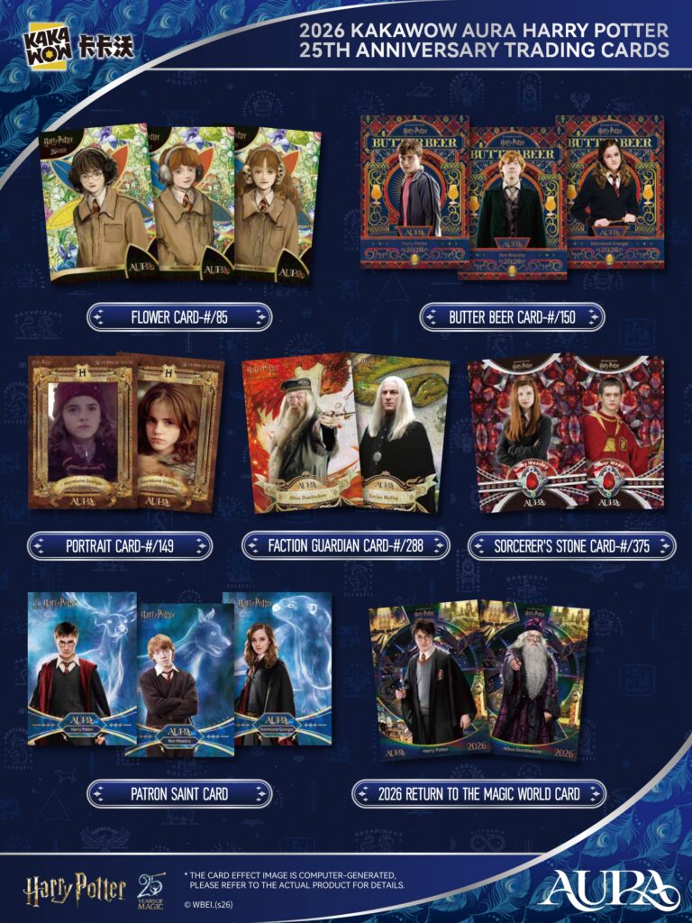 ILLUSTRATION(PART 1)/75、AUTOGRAPH/45、MAGIC TRILOGY/555、CELEBRATION/525、BONUS STORY FLOWER CARD/85、BUTTER BEER/150、PORTRAIT/149、FACTION GUARDIAN/288、SORCERER’S STONE/375、PATRON SAINT、2026 RETURN TO THE MAGIC WORLD